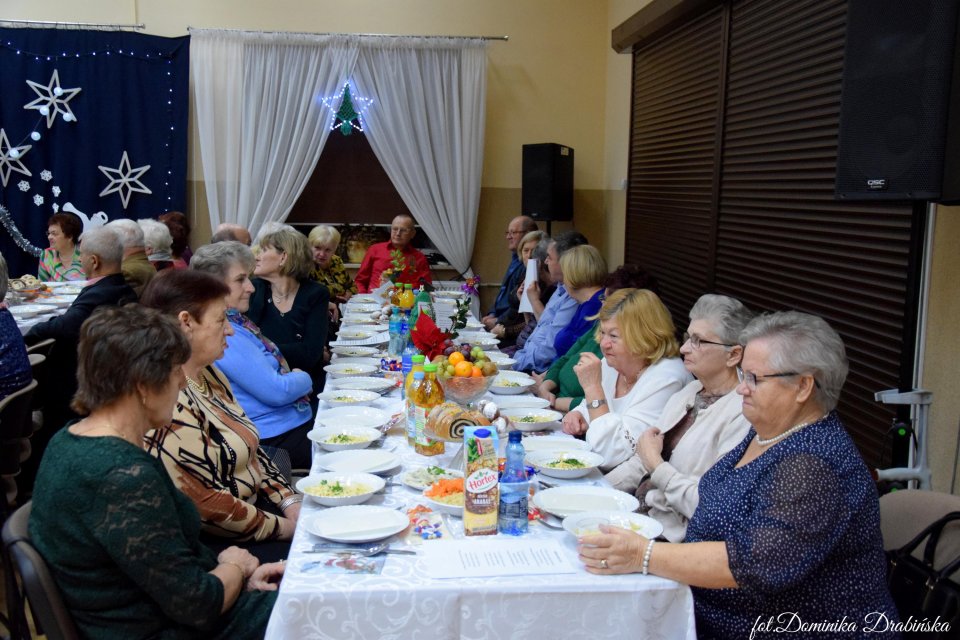 Panie przywitały przybyłych gości wśród których był Wójt Gminy Nowa Sucha Macieja Mońka, Zastępca Przewodniczącego Rady Gminy Kamil Szymański, Dyrektor Gminnego Ośrodka Kultury Ireneusz Łukawski oraz koleżanki i koledzy ze Stowarzyszenia Seniorów. Ewangelię wg św. Łukasza odczytał P. Franciszek Borucki następnie odśpiewano kolędę. Grup Teatralnej Swojaki przygotowała program słowno-muzyczny. Złożono życzenia z okazji świąt Bożego Narodzenia i Nowego Roku 2024r . Wójt Gminy Nowa Sucha Maciej Mońka zabrał głos życząc wszystkim spokojnych Świąt Bożego Narodzenia w gronie najbliższych oraz dużo zdrowia na Nowy Rok. Wszyscy wspólnie podzieliliśmy się opłatkiem po którym zasiedliśmy do kolacji wigilijnej przygotowanej przez P. Małgorzatę Milczarek. Podczas spotkania wspólnie śpiewaliśmy kolędy. Dla wszystkich gości czekały upominki które zostały przygotowane na zajęciach Rękodzieła Artystycznego pod kierunkiem P. Mirosławy Szygalskiej. Słodkie paczuszki otrzymaliśmy od firmy Mars Polska.